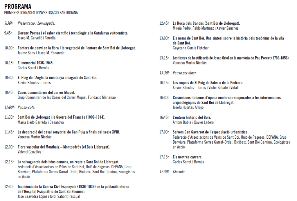 Tot i les dificultats i incerteses derivades de la situació actual, i esperonats per l’èxit de les primeres Jornades, tenim el plaer de convidar-vos a la segona edició de les Jornades d’Investigació Santboiana, Al igual que a la primera edició, la temàtica és lliure, centrada, això si en la nostra població, i oberta a tothom que vulgui compartir i donar a conèixer el seu treball.